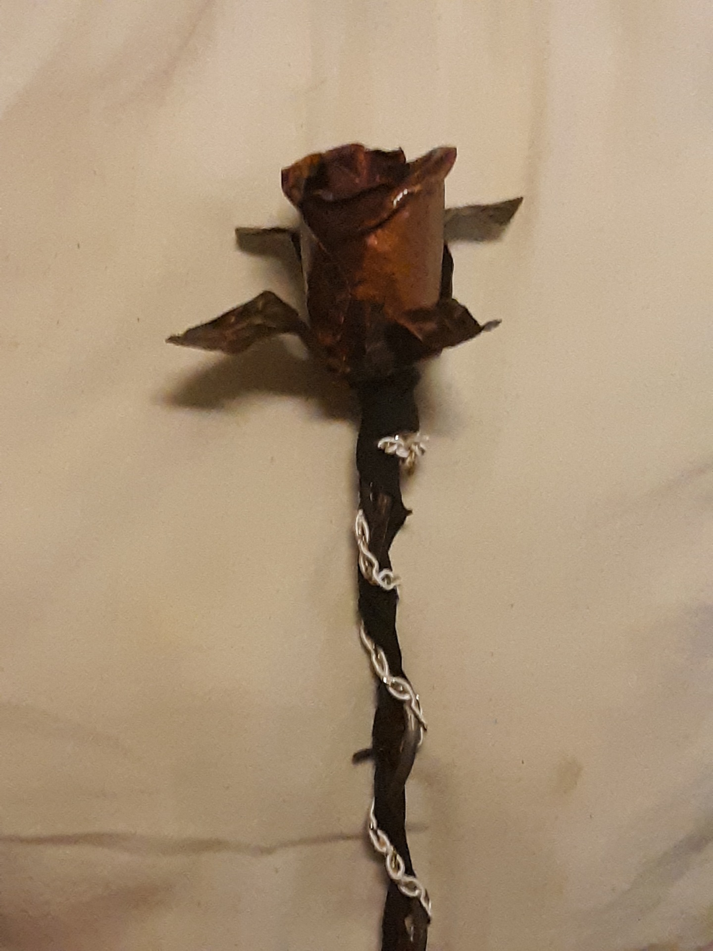 An elligent two tone patina rose. The Black baccara is the perfect mix of red and black all tied together with black, white and gold ribbon. like all our items it is made from recycled copper and each one is hand crafted just for you.
